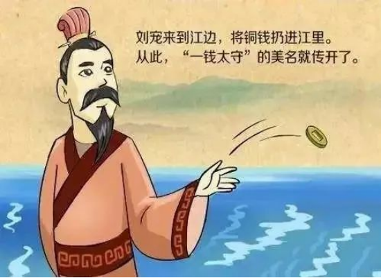 刘宠出了山阴县界,就把铜钱投到了江里,表明自己的清廉自守。从此,“一钱太守”的美称便在当地传开。
