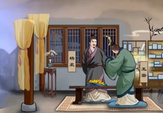 东汉杨震在赴任途中经过昌邑时,昌邑县令王密山来拜访他,并怀金十斤相赠。杨震说:“故人知君,君不知故人,何也?”王密没听明白杨震的责备之意,说:“天黑,无人知晓。”杨震说:“天知,神知,你知,我知,何谓无知?”王密这才明白过来,大感惭愧,怏怏而去。
